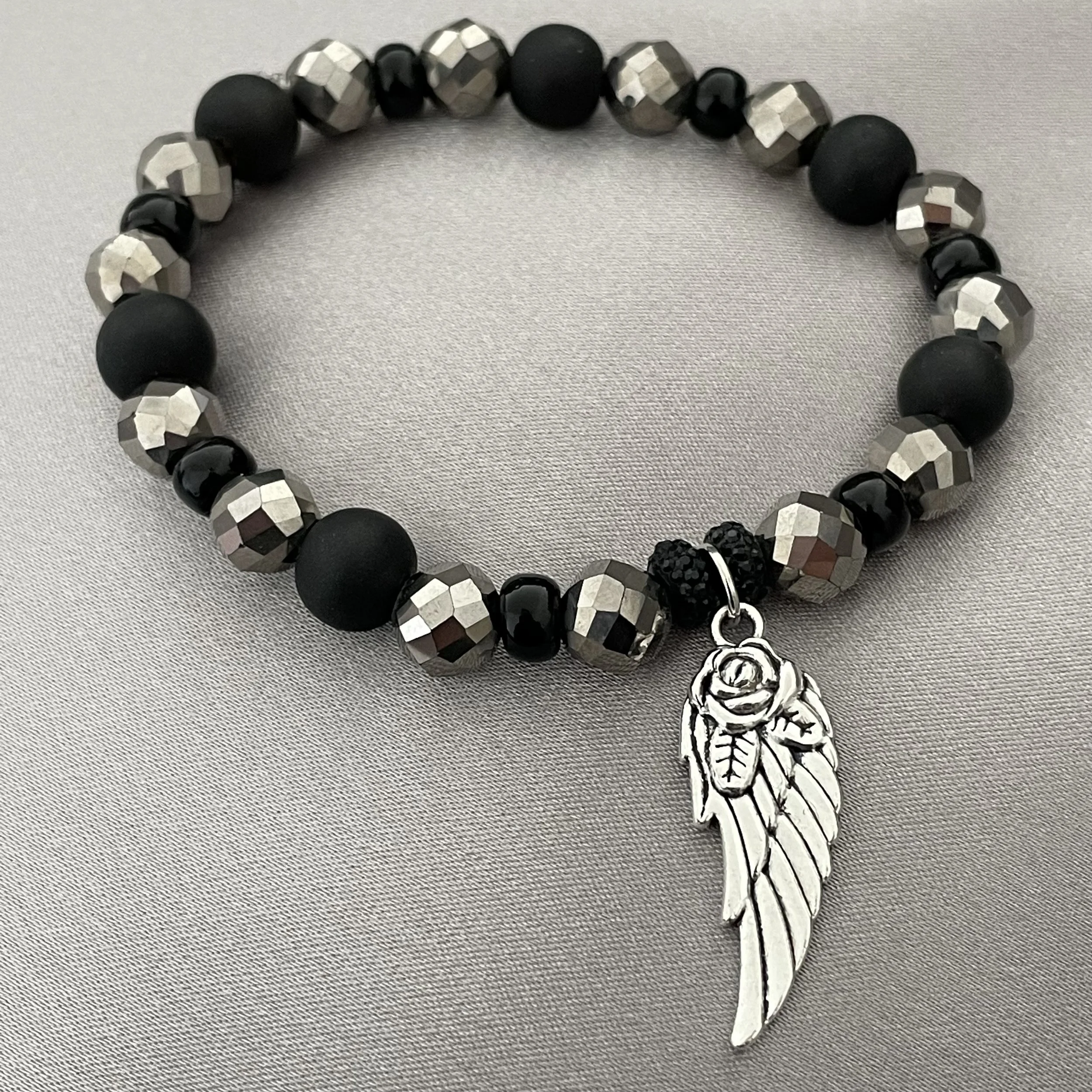 Black Bracelets › Black and Silver Beaded Bracelet W/Angel Wing Charm Image 1 of 1 Black and Silver Beaded Bracelet W/Angel Wing Charm $20.00 Size: Elastic (one size fits most) Add To Cart Added! Size: Elastic (one size fits most)