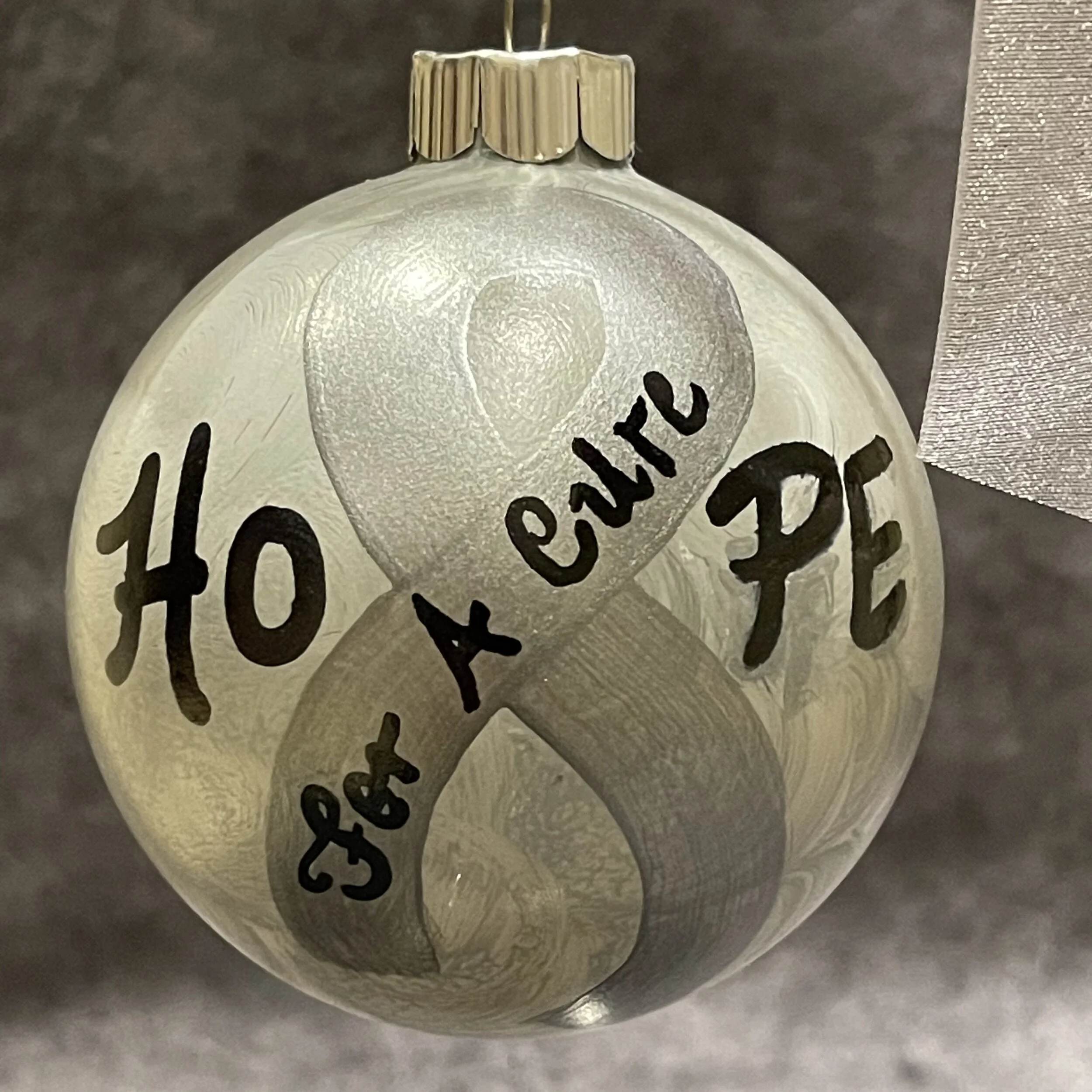 Ornaments › Gray Glass Ornament W/Gray Ribbon 'Hope For A Cure'-Medium Image 1 of 2 Image 2 of 2 Gray Glass Ornament W/Gray Ribbon 'Hope For A Cure'-Medium $15.00 Glass; measures 3.25” (8.26 cm) round Add To Cart Added! Glass; measures 3.25” (8.26 cm) round