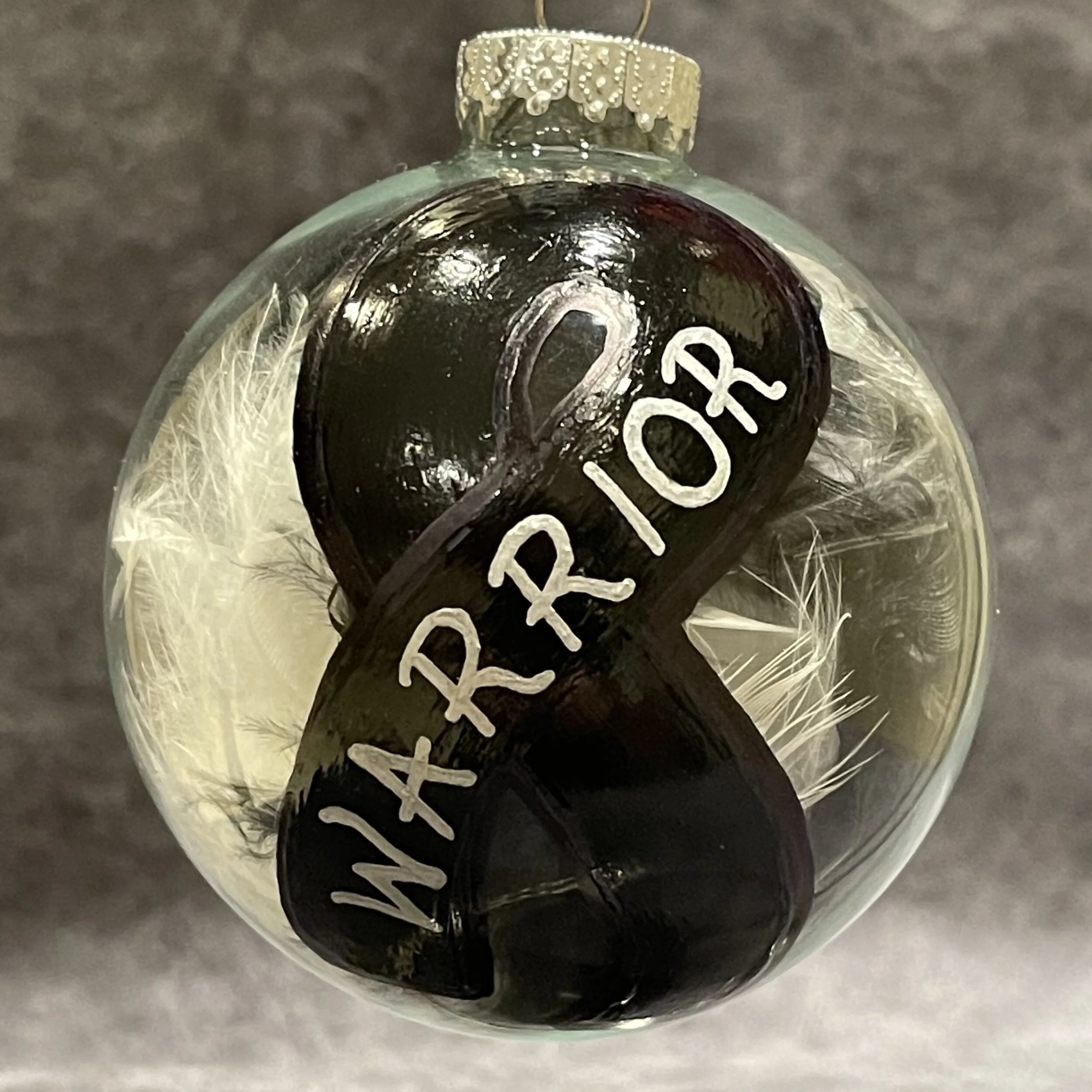 Ornaments › Clear Round Glass Ornament W/Black Ribbon 'Warrior'-Medium Image 1 of 2 Image 2 of 2 Clear Round Glass Ornament W/Black Ribbon 'Warrior'-Medium $15.00 Glass; measures 3.25” (8.26 cm) roundFilled with White/Black Feathers Add To Cart Added! Glass; measures 3.25” (8.26 cm) roundFilled with White/Black Feathers