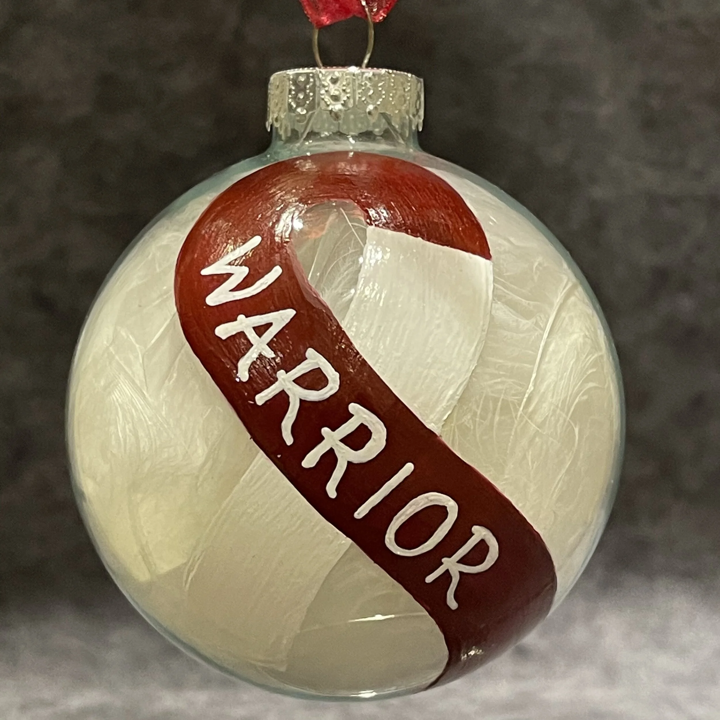 Ornaments › Clear Round Glass Ornament W/Burgundy/White Ribbon 'Warrior'-Medium Image 1 of 2 Image 2 of 2 Clear Round Glass Ornament W/Burgundy/White Ribbon 'Warrior'-Medium $15.00 Glass; measures 3.25” (8.26 cm) roundFilled with White Feathers Add To Cart Added! Glass; measures 3.25” (8.26 cm) roundFilled with White Feathers