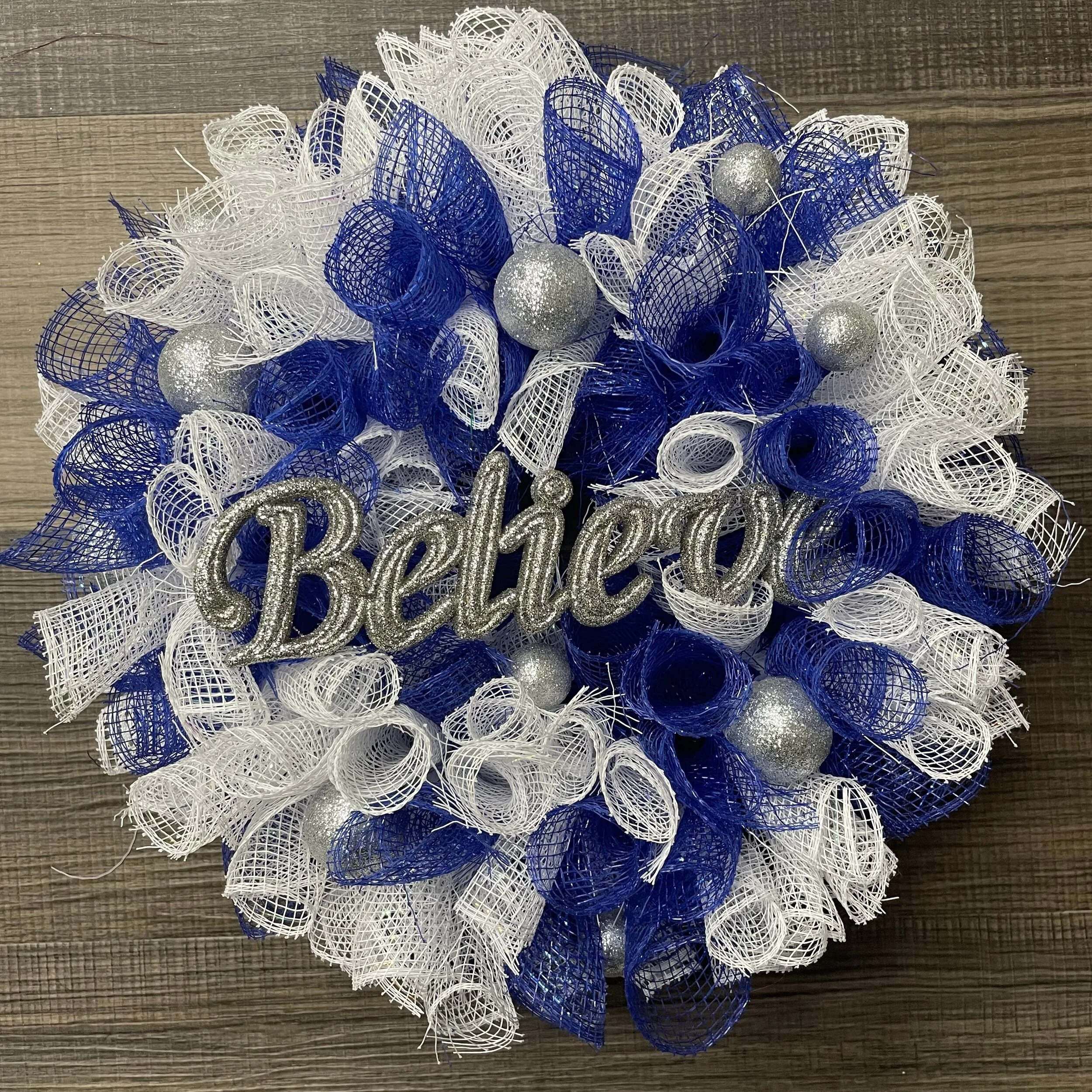 Wreaths › Dark Blue and White Wreath W/Believe - Small Image 1 of 1 Dark Blue and White Wreath W/Believe - Small $35.00 Approximate Dimensions - 13” Diameter x 5” Depth*Size may vary depending on the embellishments. Add To Cart Added! Approximate Dimensions - 13” Diameter x 5” Depth*Size may vary depending on the embellishments.